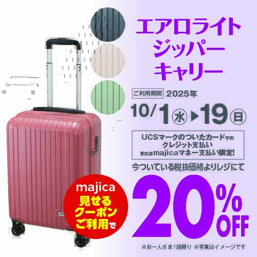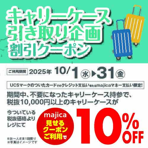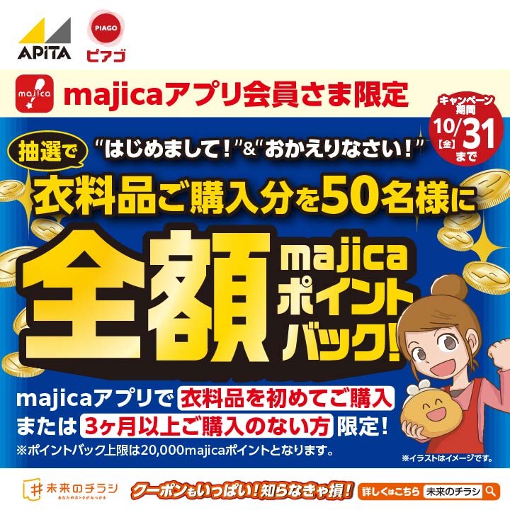 はじめまして&おかえりなさいキャンペーン(50名様全額majicaポイントバック) 対象者①②を自動エントリーで、指定の衣料品対象金額を全額バック(majicaポイントにて) ①対象期間中(10/1~31)にはじめてmajicaで指定の衣料品をご購入の方 ②夏物(5~7月)に衣料品を未購入で対象期間にmajicaで指定の衣料品をご購入の方