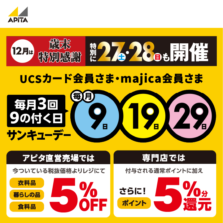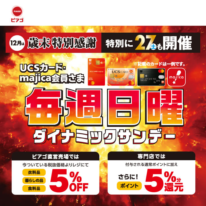 はじめまして&おかえりなさいキャンペーン(50名様全額majicaポイントバック) 対象者①②を自動エントリーで、指定の衣料品対象金額を全額バック(majicaポイントにて) ①対象期間中(12/1~31)にはじめてmajicaで指定の衣料品をご購入の方 ②特別招待クーポンをご利用の方(夏季3ヶ月間に衣料品を未購入の方に配信をしております)